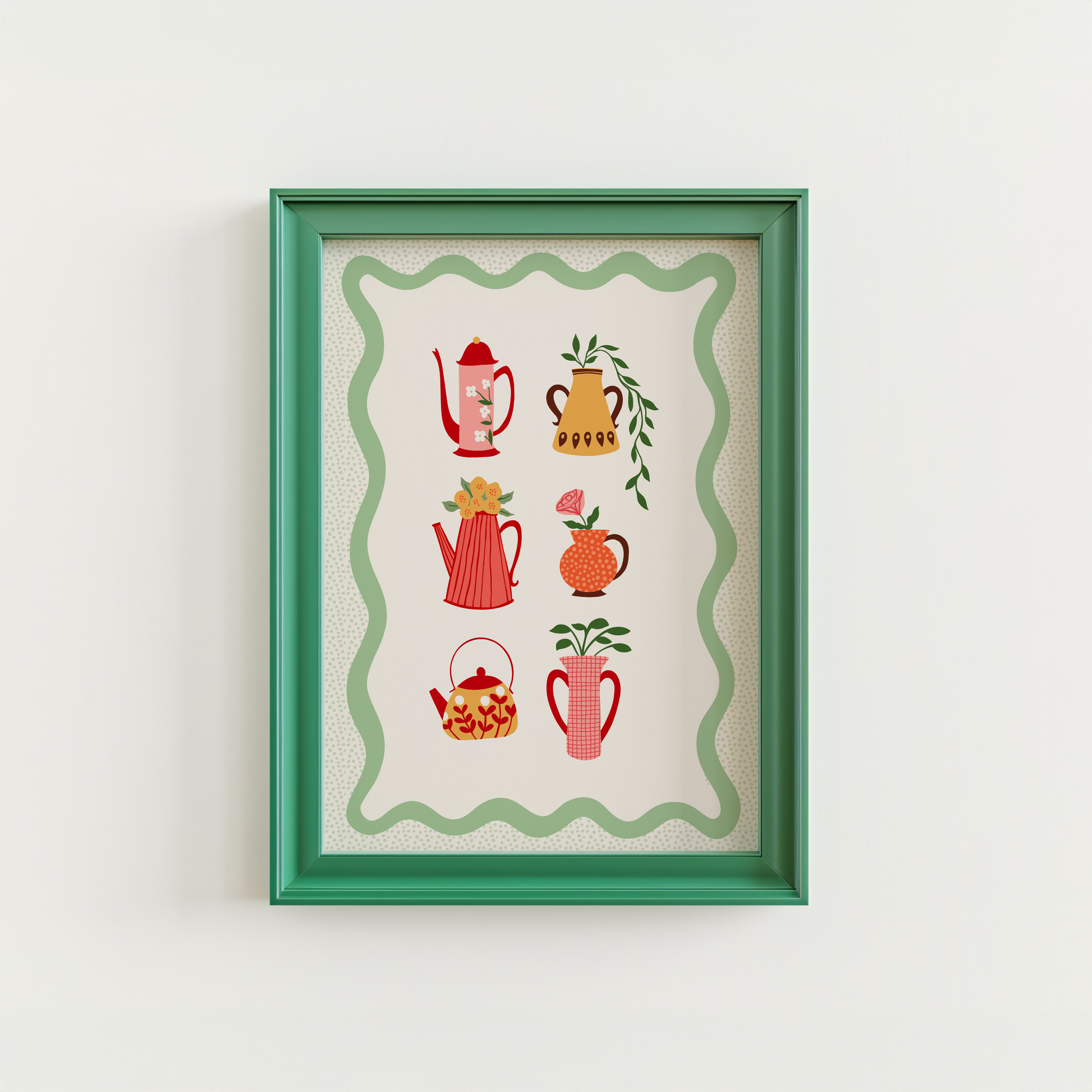 Celebrate cosy vibes and seasonal tones with this whimsical vase illustration print! Featuring six quirky vases - each with its own shape, pattern and personality - filled with greenery or florals in a gorgeous autumnal palette. The soft cream and pale green patterned background, framed with a wiggly pale green border, gives the piece a gentle vintage charm while keeping it playful and modern. A lovely choice for kitchens, hallways, or anywhere in need of a warm botanical touch 🍁