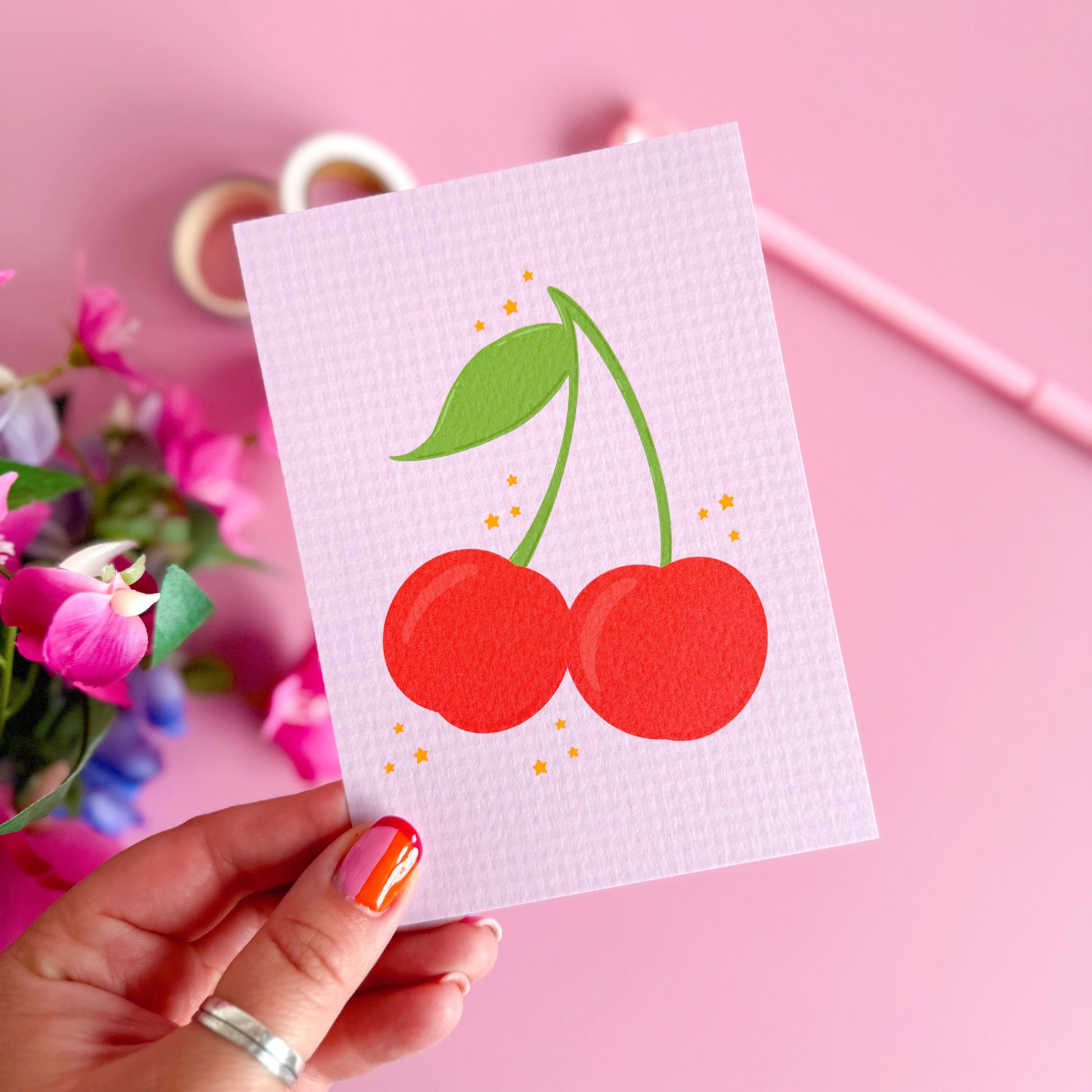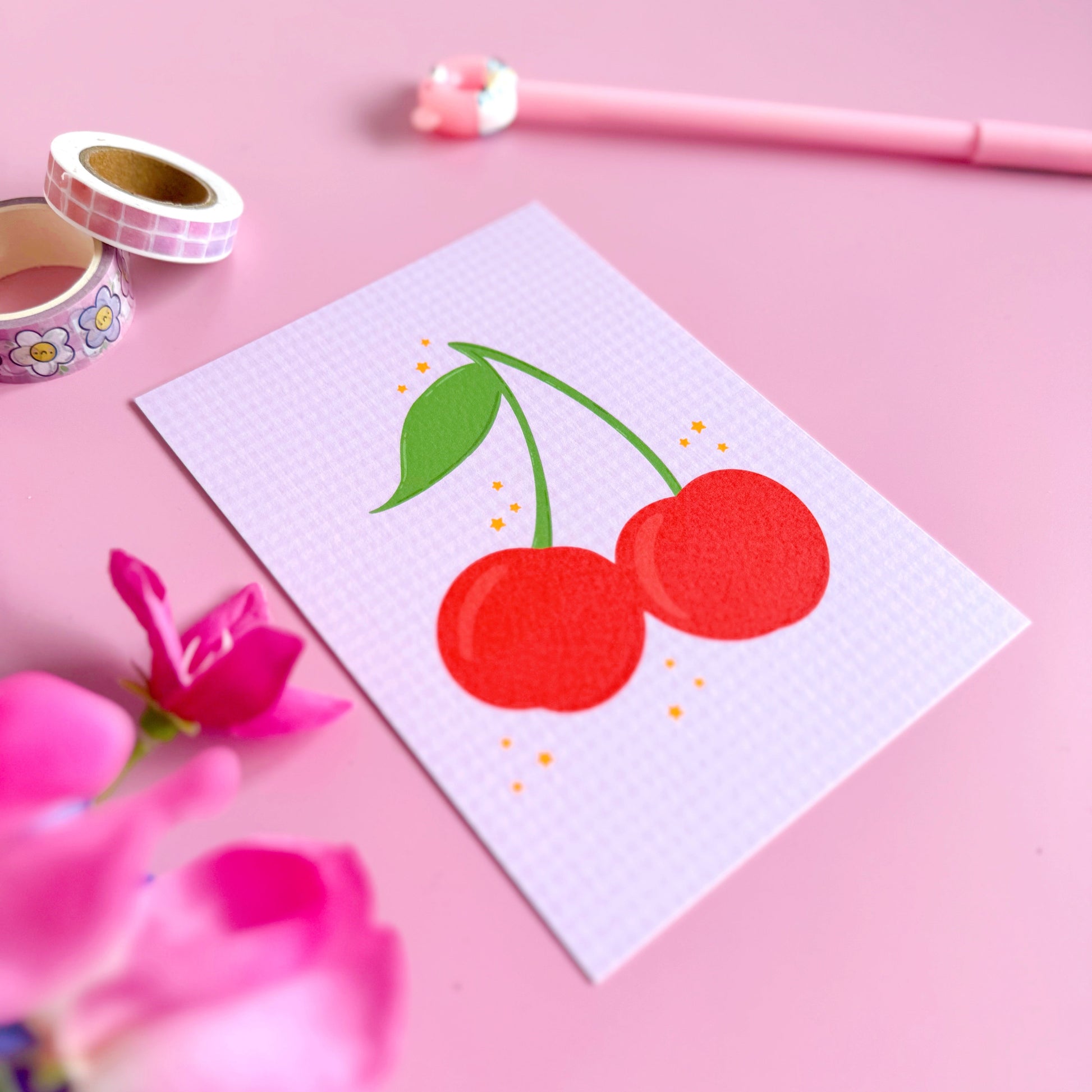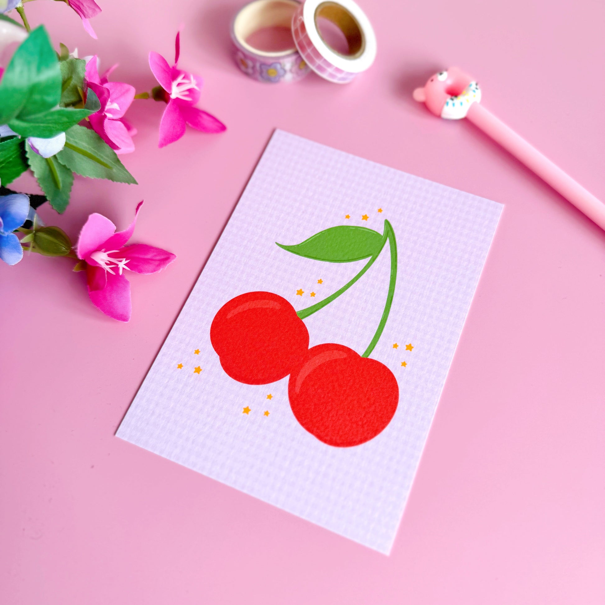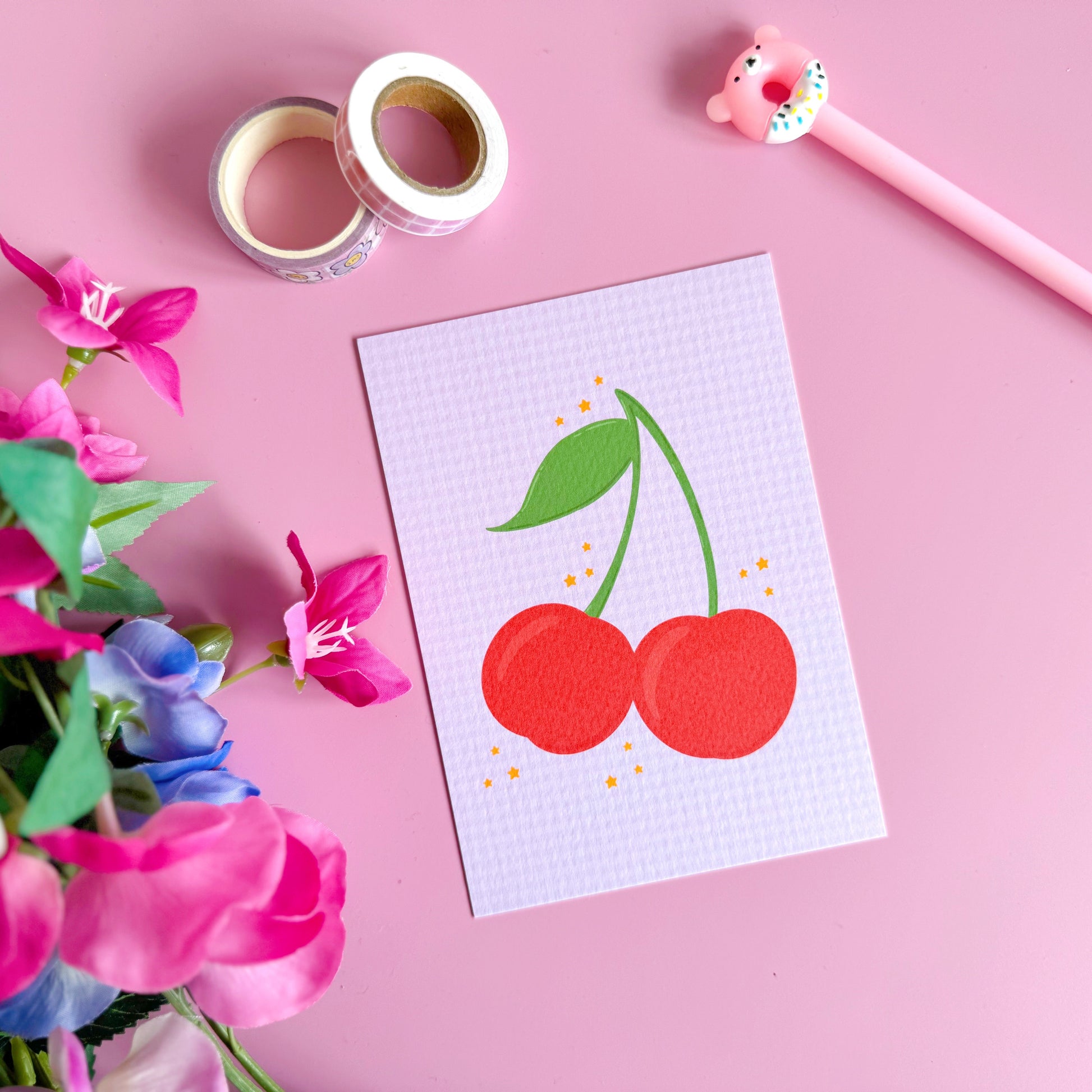 Bright, bold, and irresistibly cute - this cherry postcard is a sweet celebration of fruity fun! With two big red cherries illustrated on a soft lilac gingham background, this design is perfect for popping in the post, styling as mini wall art, or adding a joyful touch to a gift. Printed on luxury textured card stock for that premium feel.