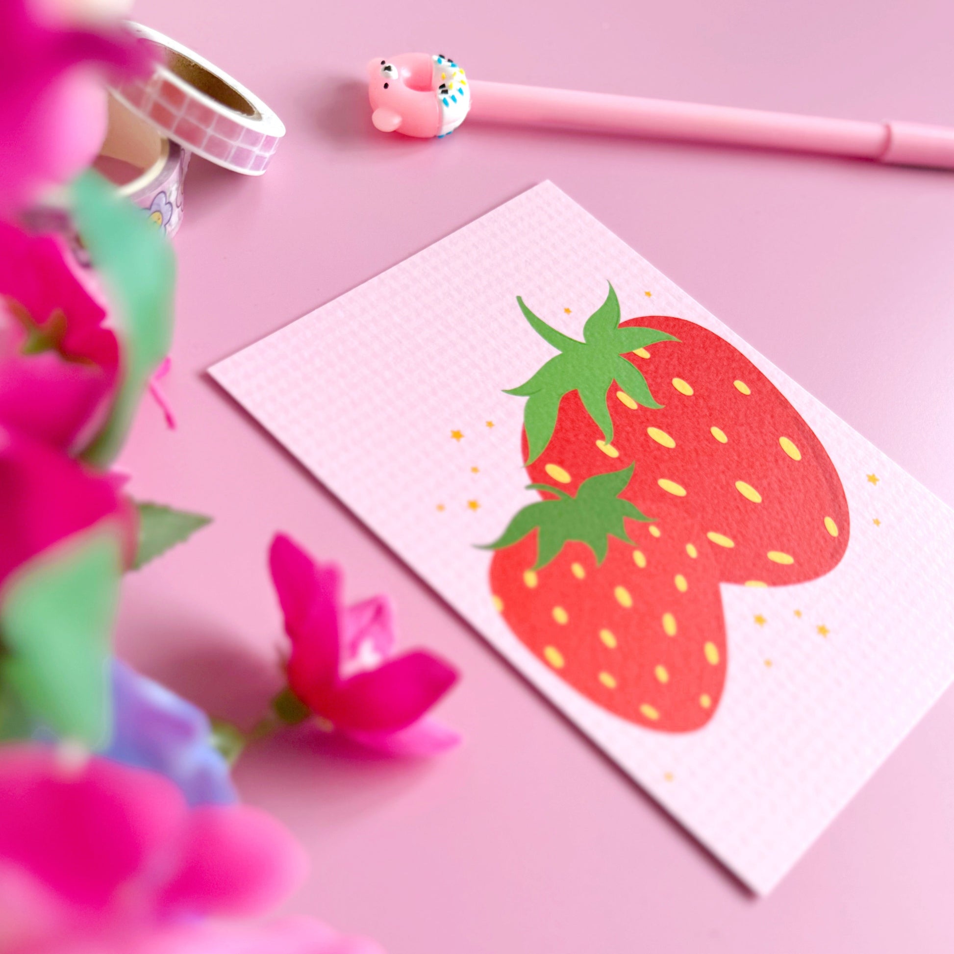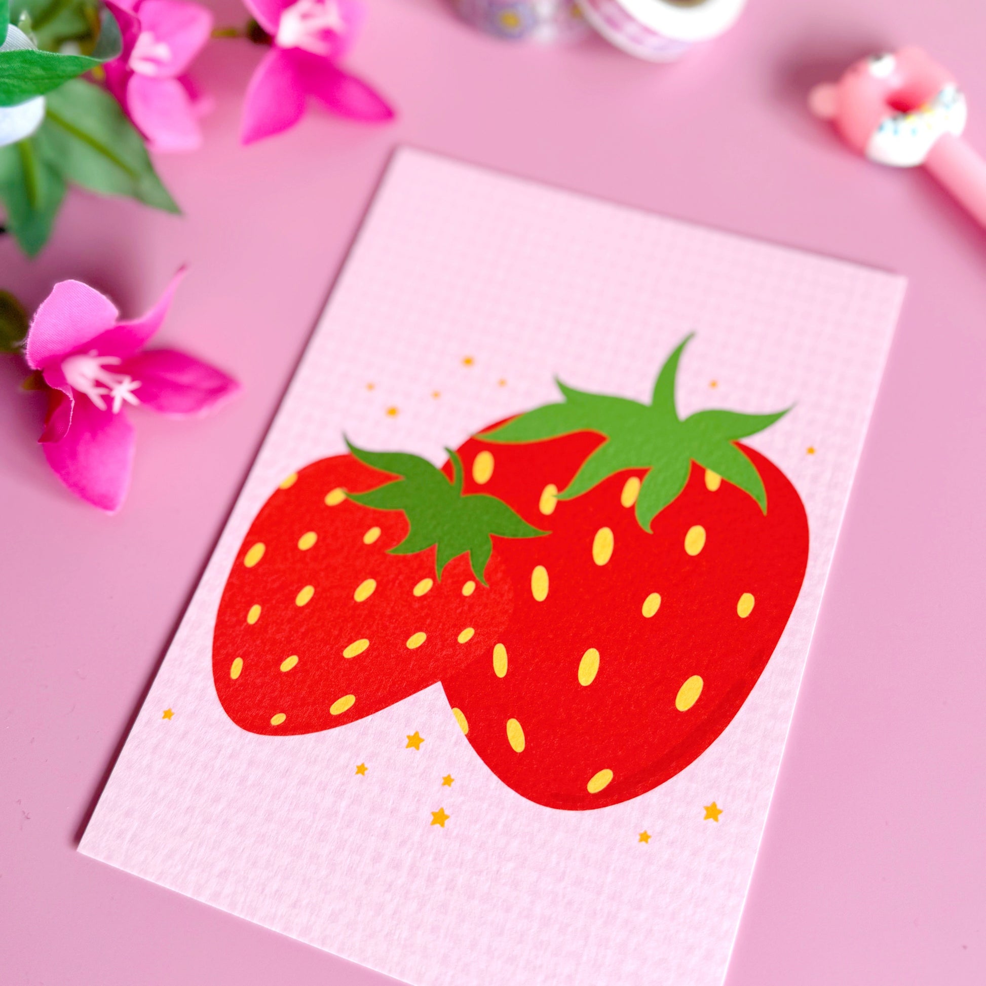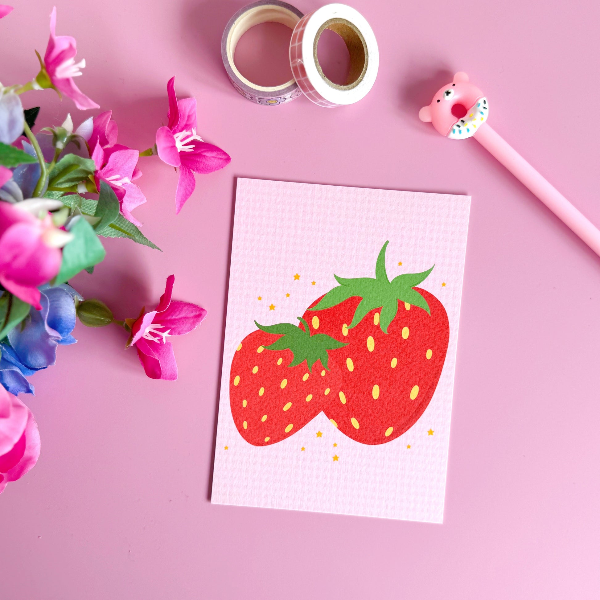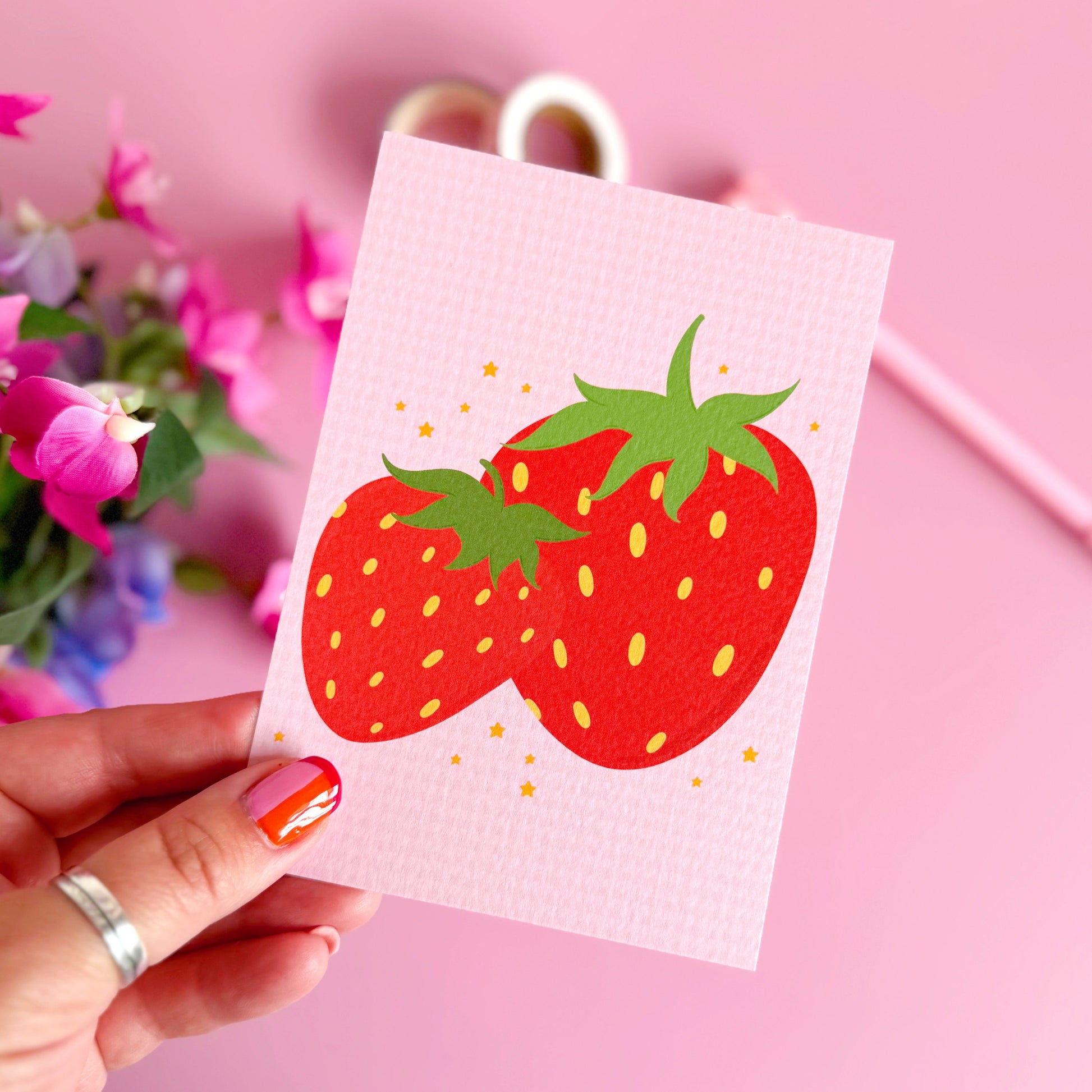 Sweet, simple, and bursting with charm - this strawberry postcard is perfect for anyone who loves fruity stationery with a vintage-inspired twist. Featuring two illustrated red strawberries on a soft pink gingham background, it’s a lovely little piece to post to a friend, use as a mini print, or tuck into a thoughtful gift. Printed on luxury textured card for that extra special feel.