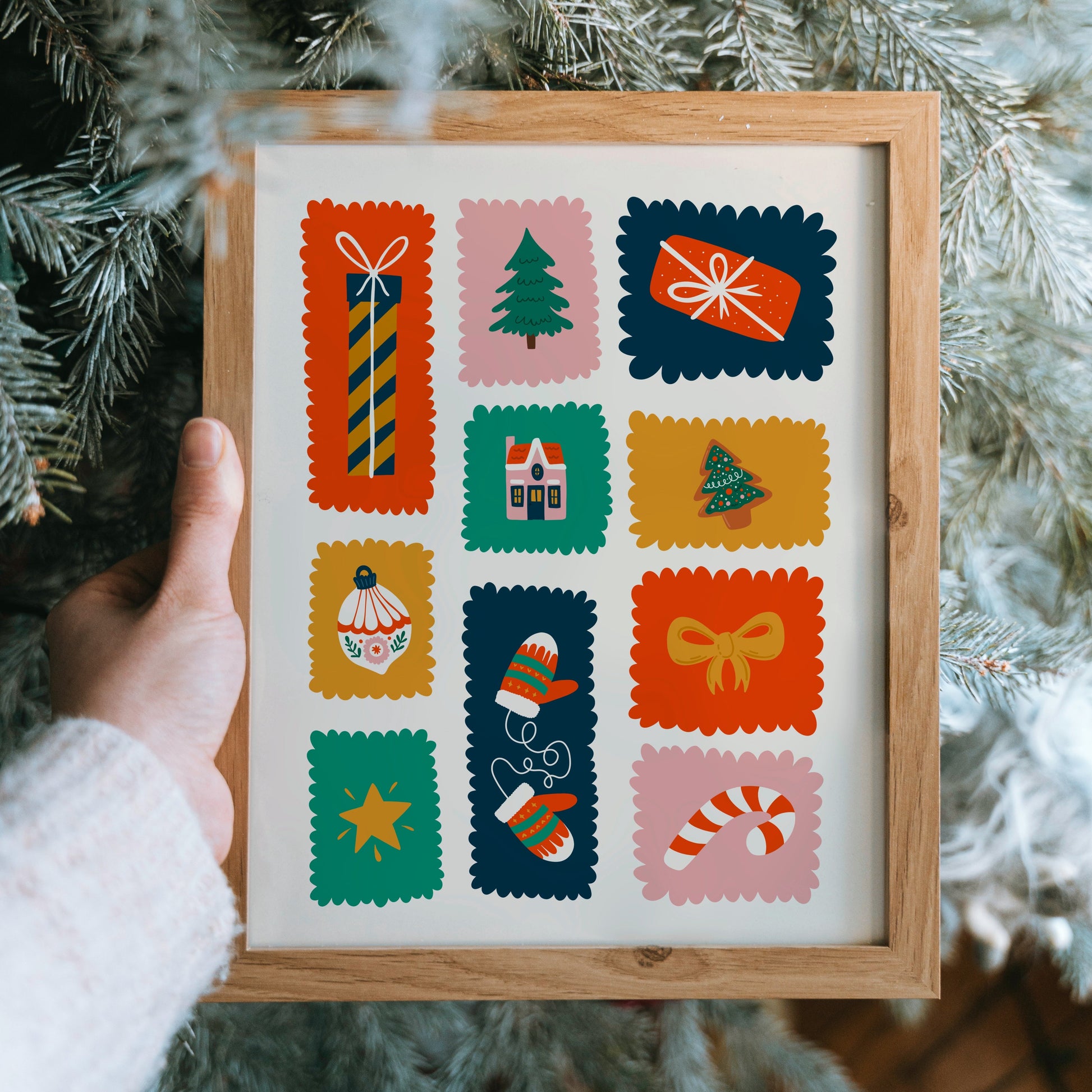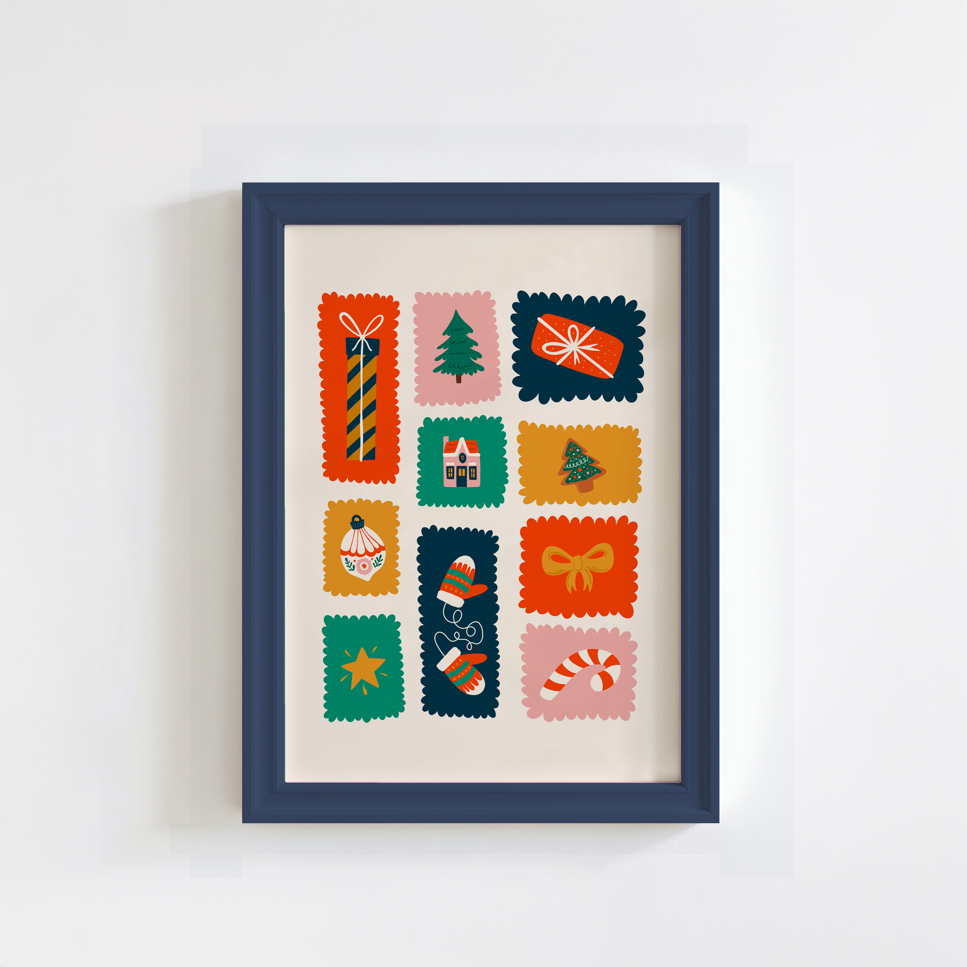 This joyful Christmas wall art print is bursting with seasonal cheer! Featuring a grid of brightly coloured squares (just like festive stamps), each one holds a whimsical holiday illustration - from gingerbread cookies and twinkling stars to cosy cottages, Christmas trees, and carefully wrapped presents. It’s the perfect print to bring a playful, storybook feel to your festive decor.