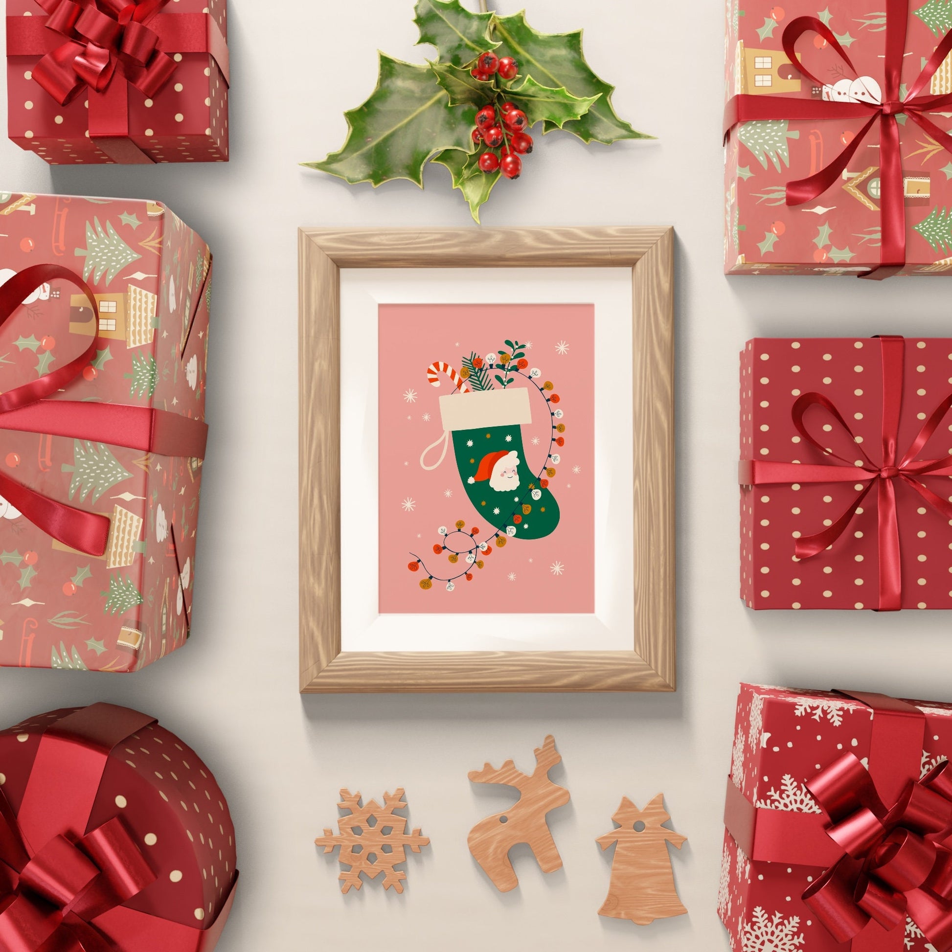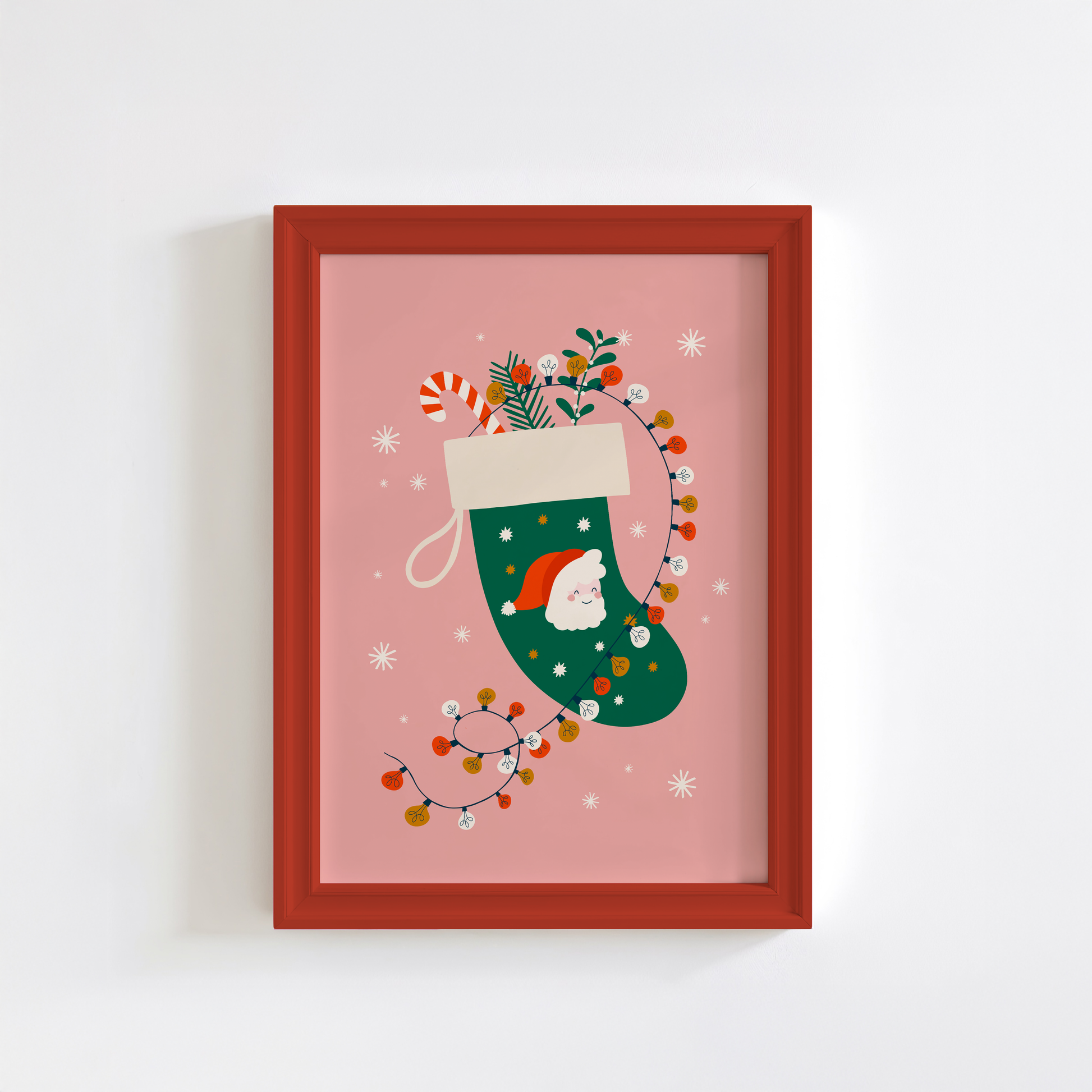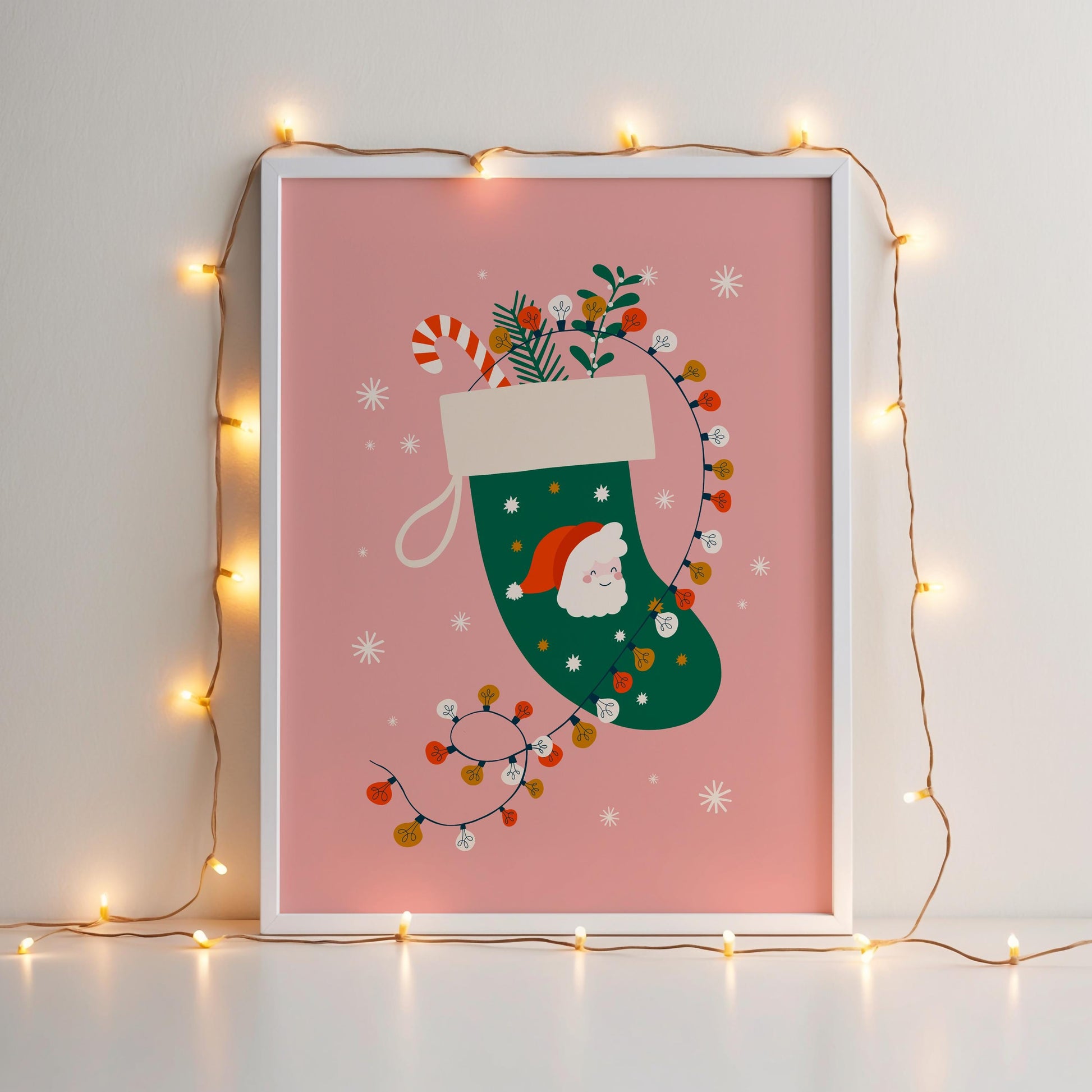 Get into the festive spirit with this charming Christmas print featuring a classic green stocking against a warm pink background. The stocking is filled with a sweet candy cane and sprigs of mistletoe and holly, wrapped lovingly in twinkling fairy lights. Adorned with a cute Santa illustration, this print brings a joyful, cosy feel to any room during the festive season.