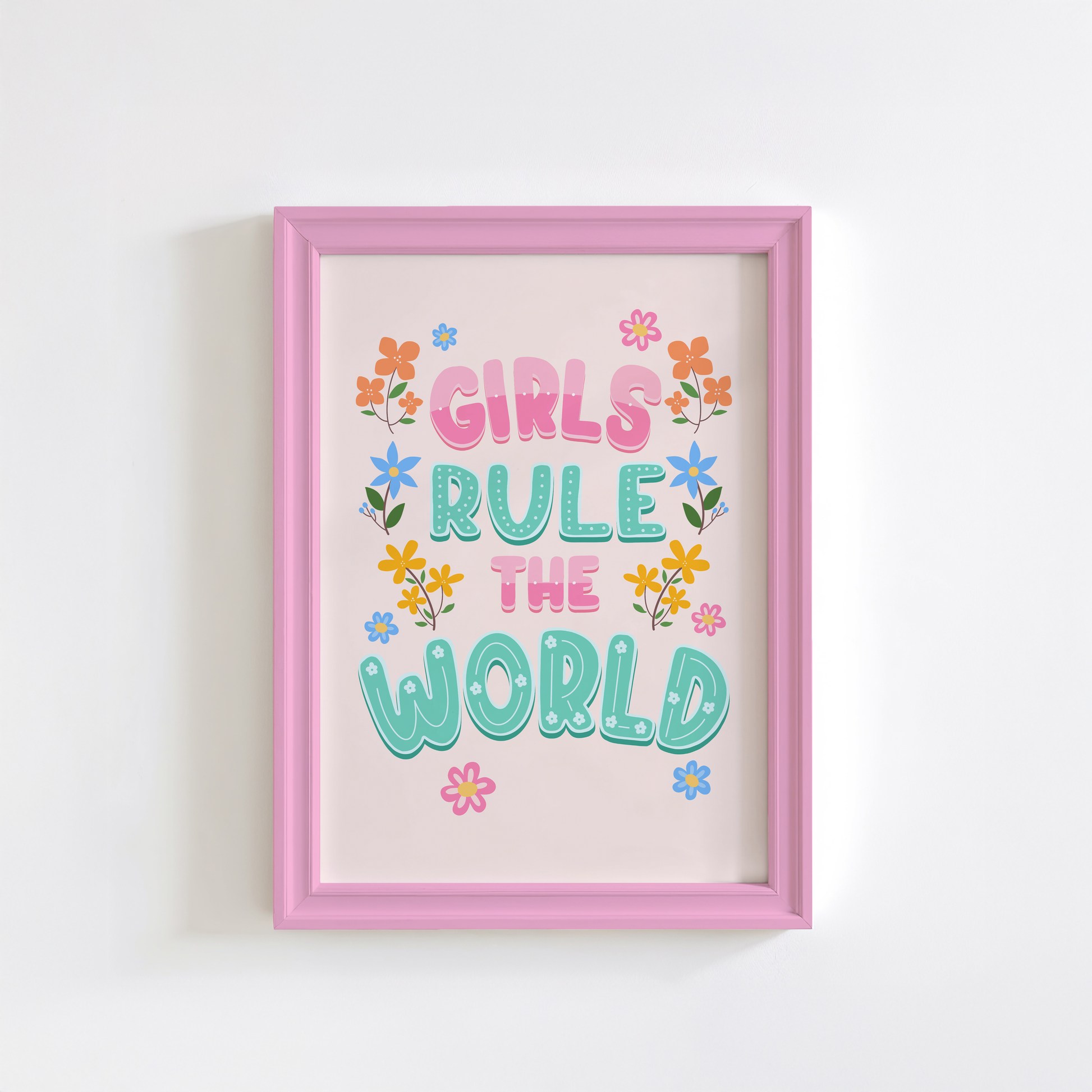 Make a bold, joyful statement with this empowering art print! Set on a soft yellow background, this design features the quote "girls rule the world" in chunky pink and teal hand-lettering, surrounded by playful floral doodles. It’s bright, fun, and full of feel-good energy - perfect for adding a splash of positivity to bedrooms, offices, or gallery walls.