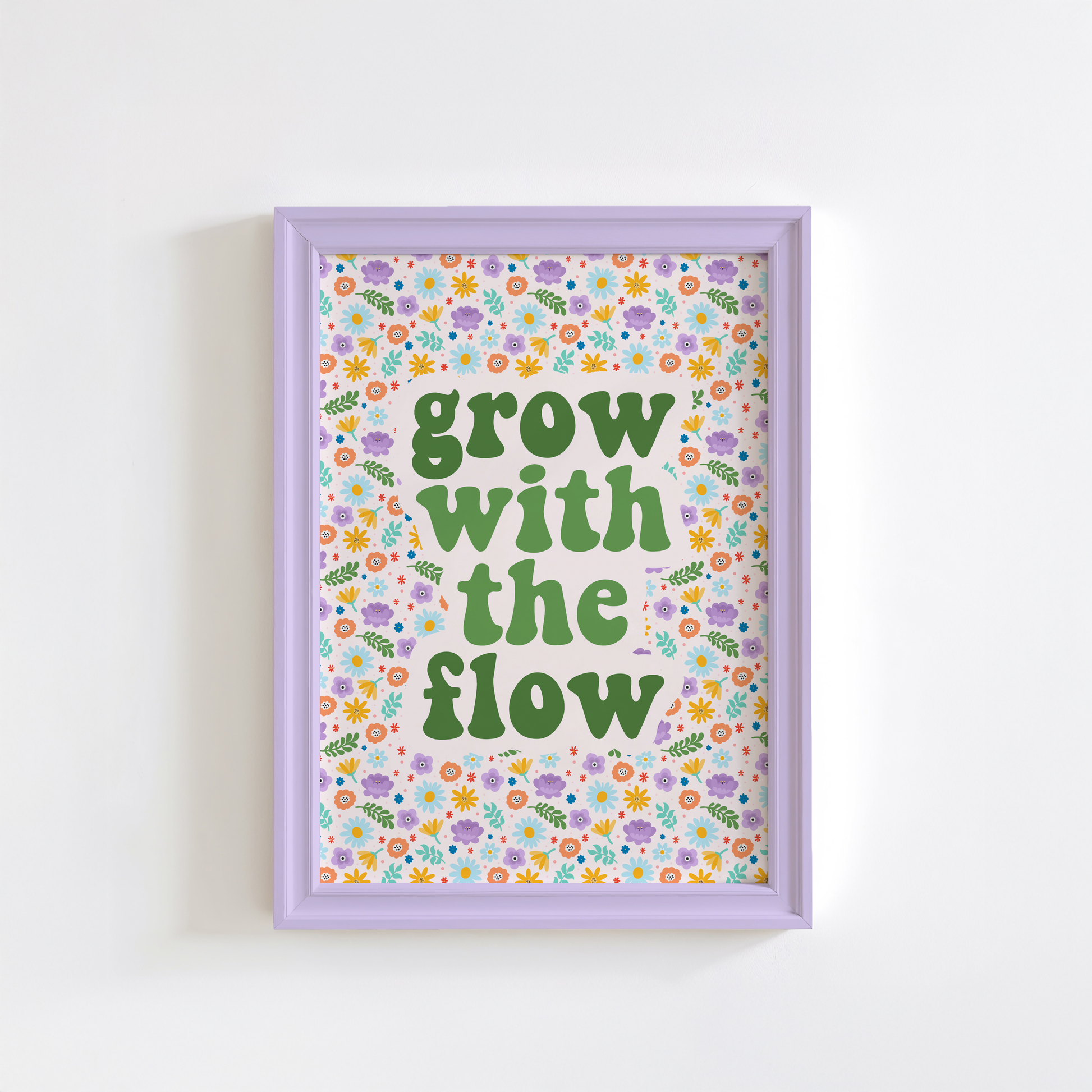 Add a burst of colour and calm to your walls with this joyful floral art print. Featuring a bold and bright flower-filled background, this design centres around the uplifting phrase "grow with the flow" in chunky green lettering. It’s a gentle reminder to take things at your own pace, surrounded by vibrant blooms to brighten any space.