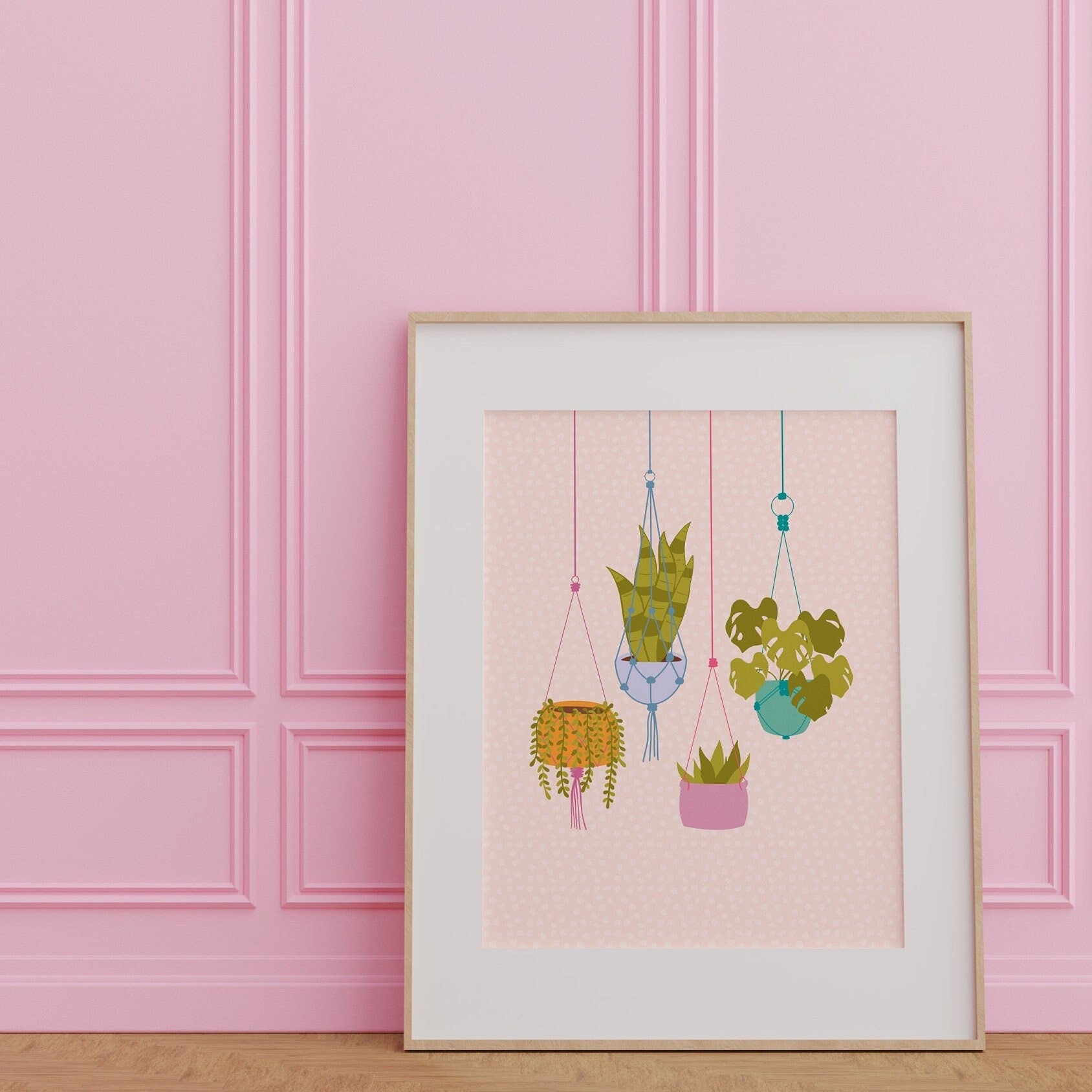 Bring a little leafy loveliness to your walls with this cheerful plant-themed art print! Featuring four beautifully illustrated hanging houseplants - a snake plant, monstera, aloe vera and a sweet little string of pearls - each one sits in a colourful hanging basket against a soft peachy-pink polka dot background. It's the perfect way to add a splash of greenery and colour to any space.