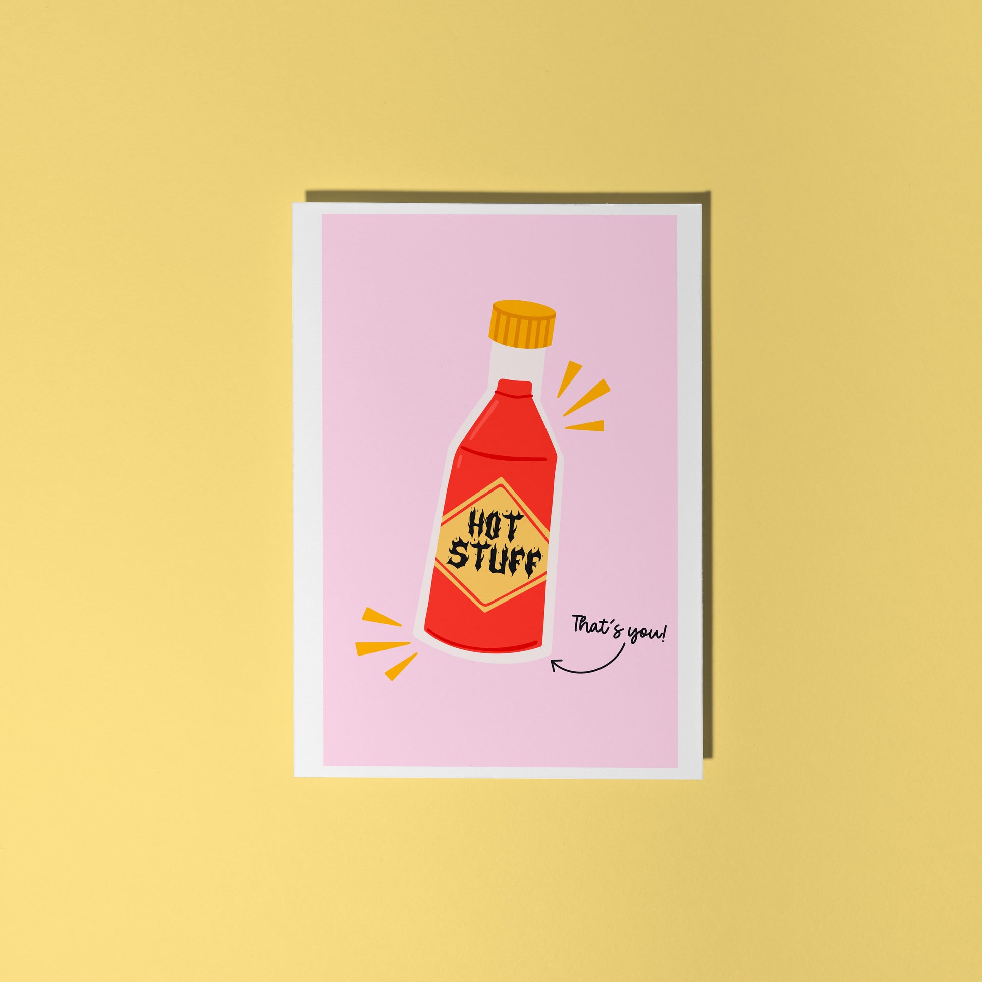 Turn up the heat with this spicy little love card! 🌶️🔥 Featuring a bottle of hot sauce and the bold message "HOT STUFF," this card is the perfect way to let your partner, crush, or bestie know just how sizzling they are!