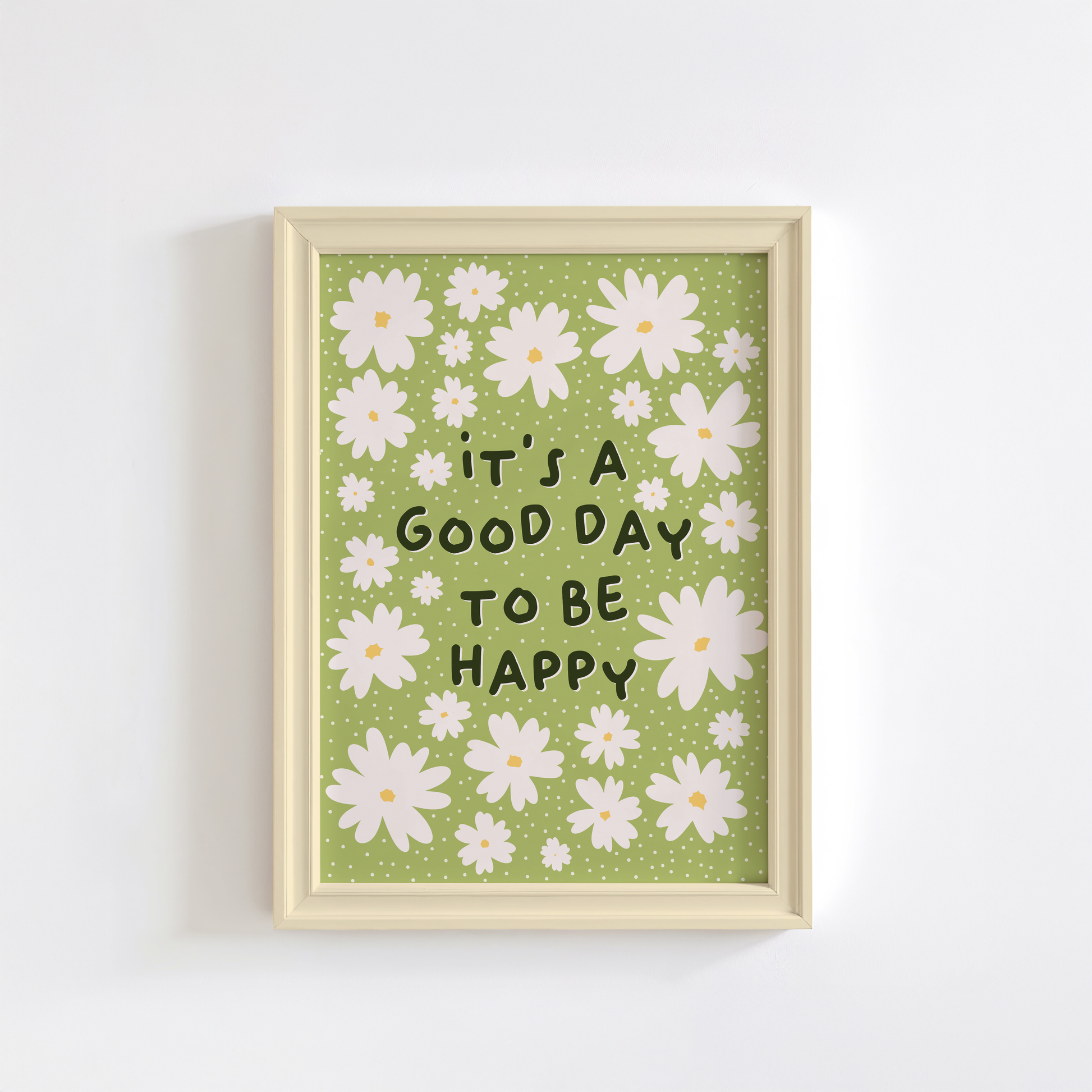 Brighten up any room with this uplifting print featuring the words "It's a good day to be happy" in hand-drawn lettering, surrounded by an array of cheerful daisies. This vibrant design reminds you to embrace positivity and enjoy the little things. Whether you’re looking to add some joy to your office, living room, or bedroom, this print is the perfect way to do it!