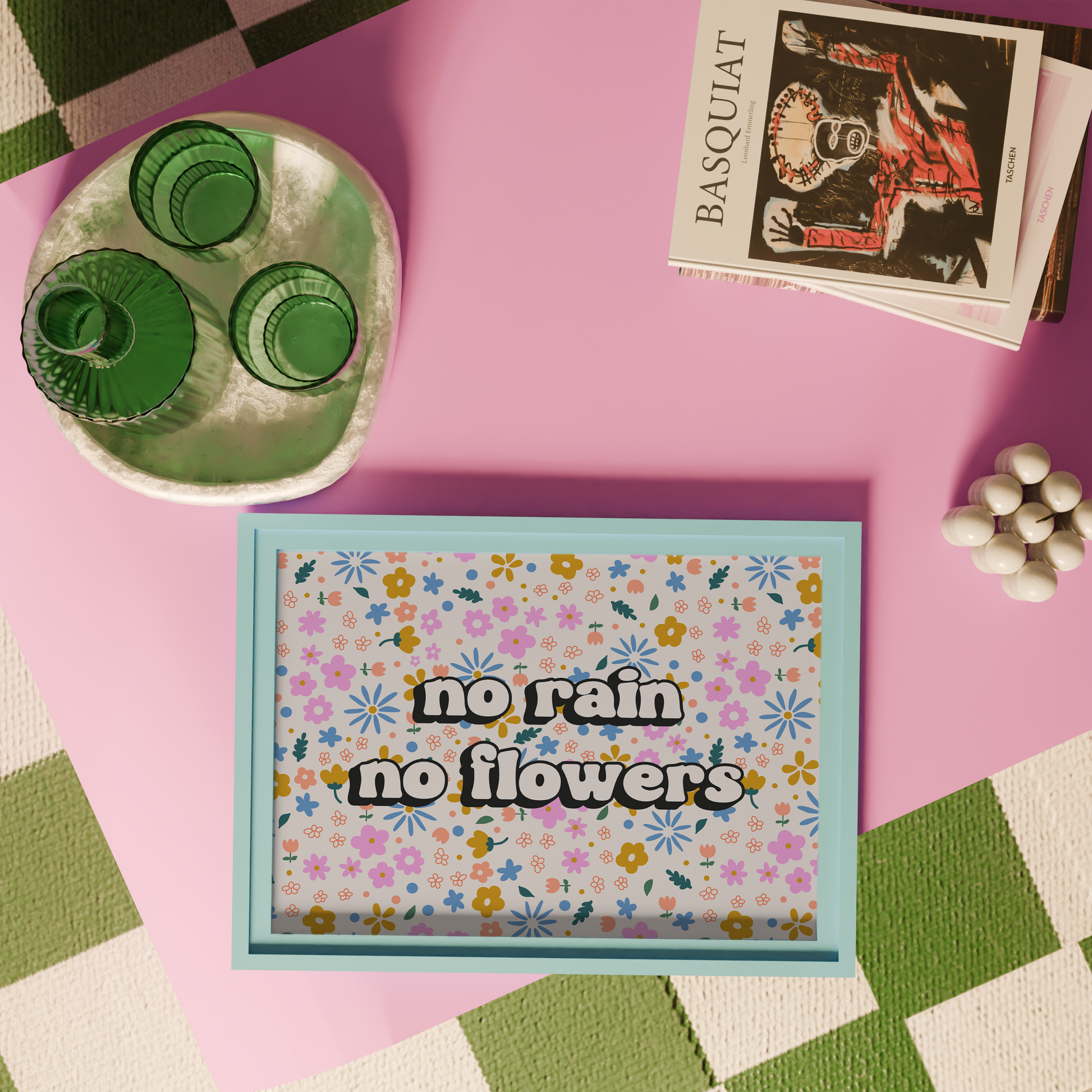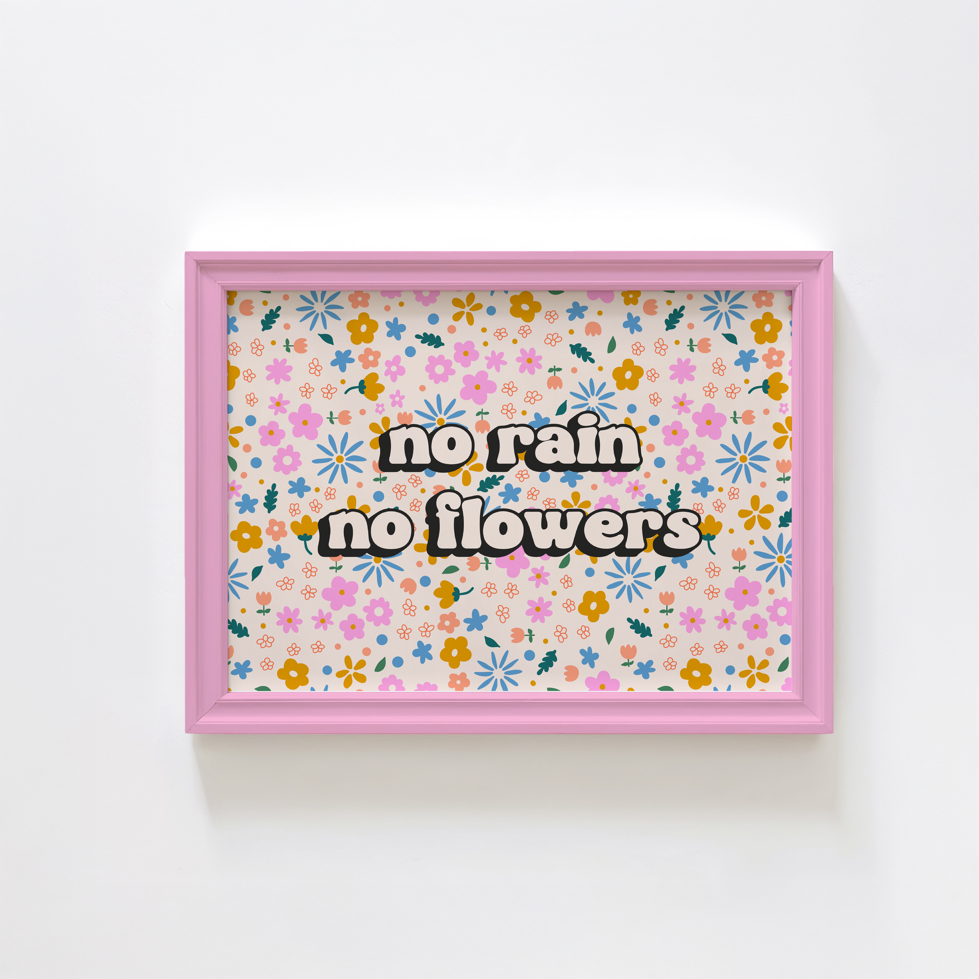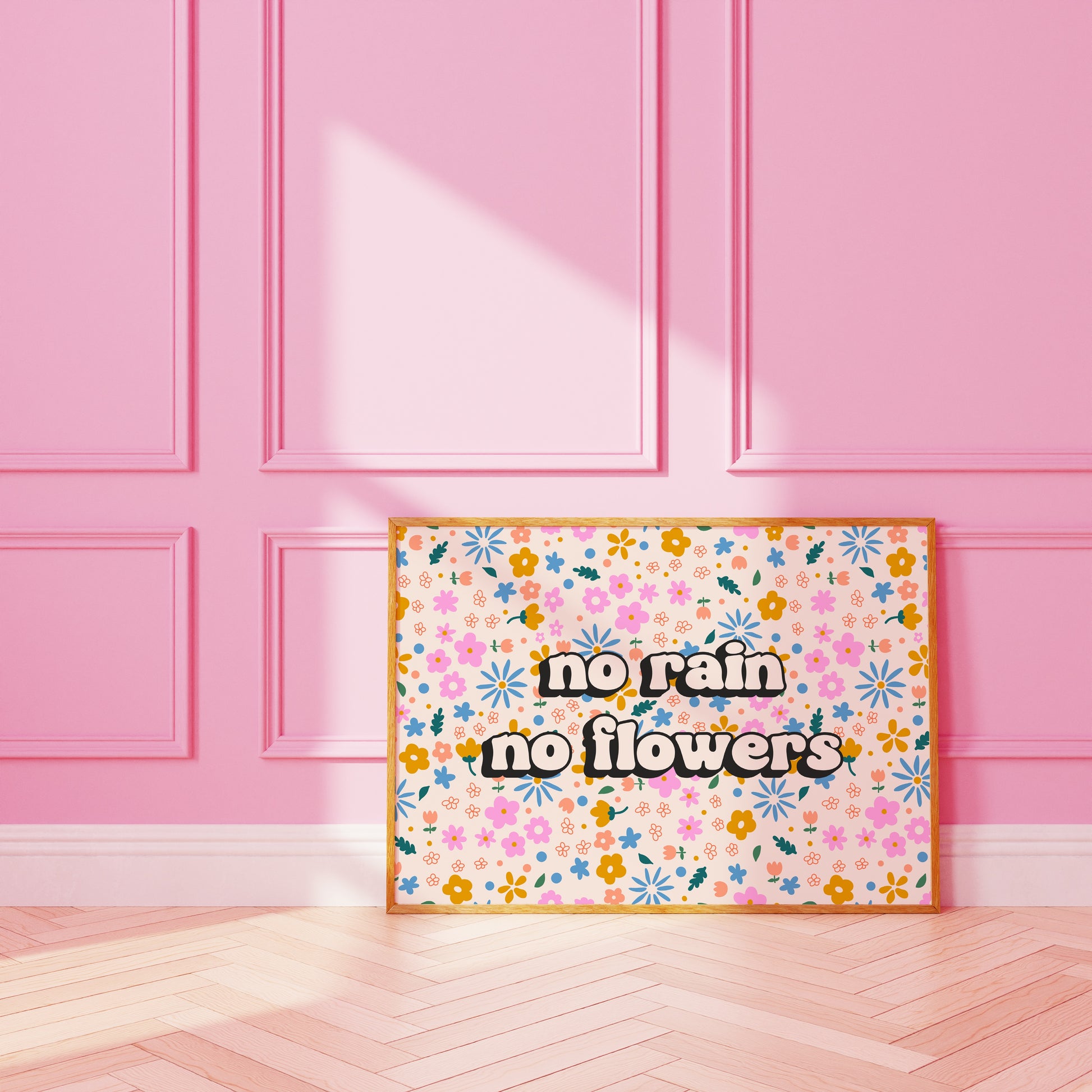 Make your walls bloom with this floral-inspired art piece featuring a vibrant background and the inspirational quote, 'No rain, no flowers'. Brighten up your space and remind yourself to appreciate the hardships that come along, for they bring growth!