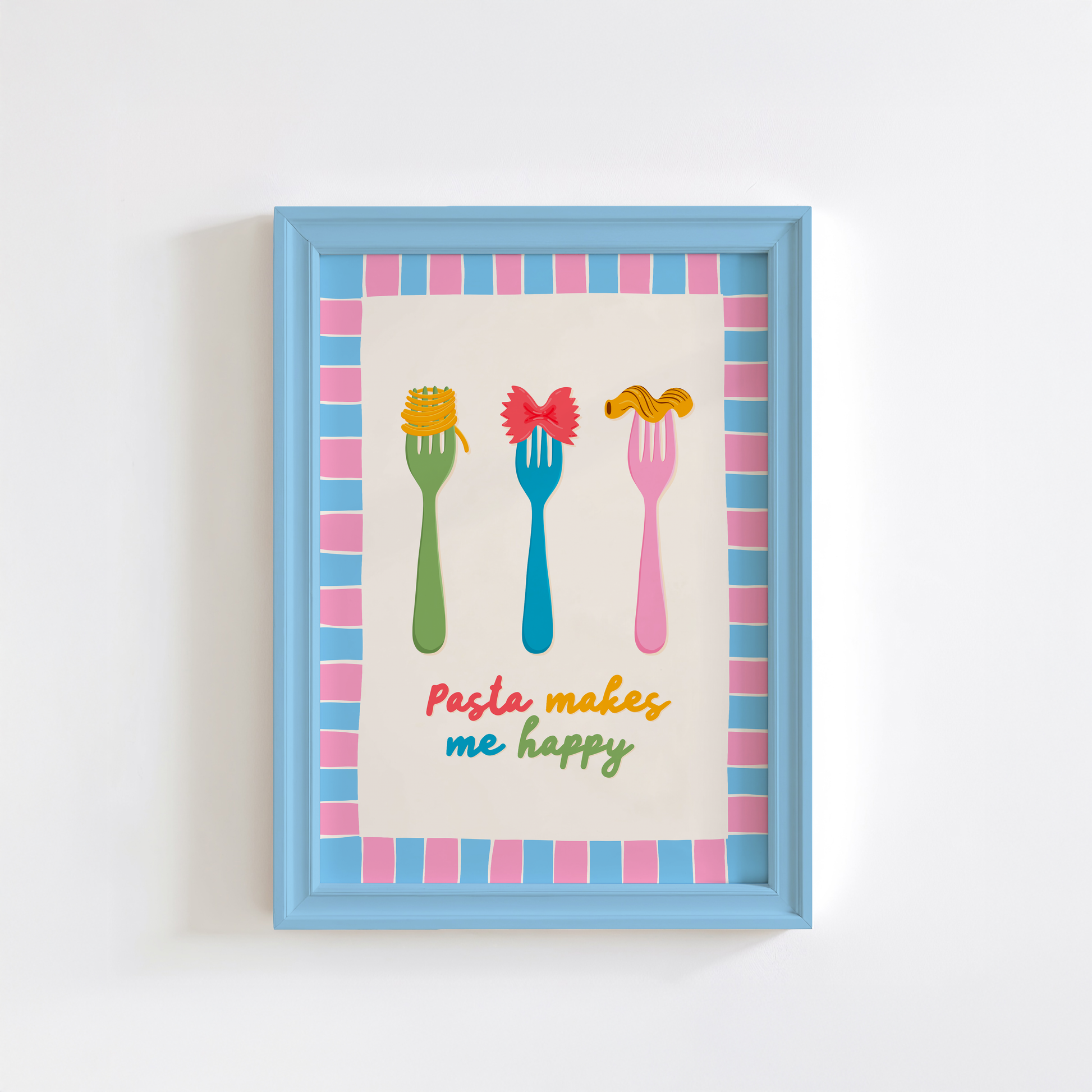 Brighten up your kitchen with this playful Pasta Makes Me Happy Print. This wall art is perfect for any pasta or food lover. Bring a smile to your face every time you enter your kitchen!