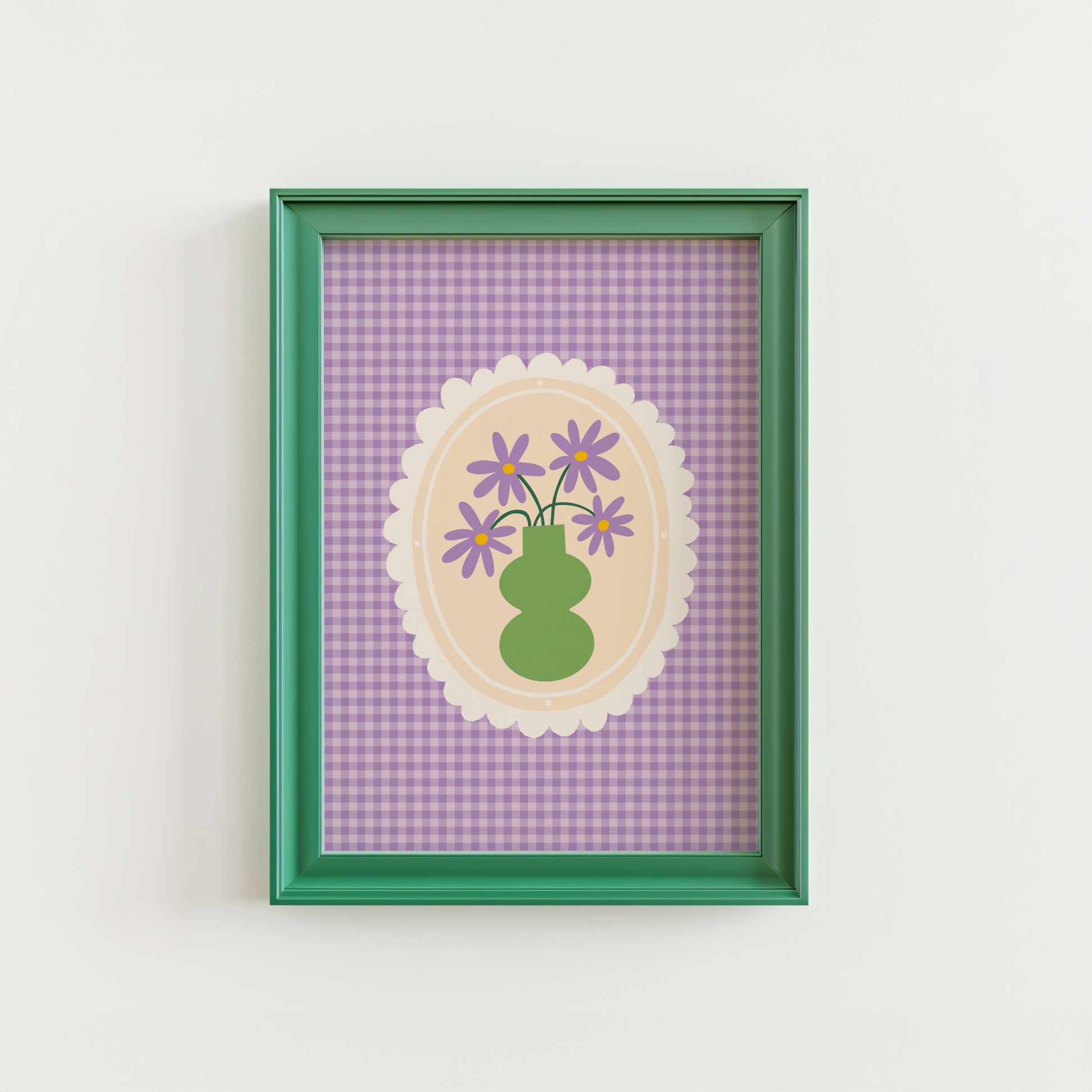 Brighten up your space with this dopamine decor-inspired floral print! Featuring a soft purple gingham background and a vibrant illustrated vase of flowers, this piece is bursting with feel-good energy. Perfect for gallery walls, bedrooms, or anywhere that needs a pop of colour and joy.