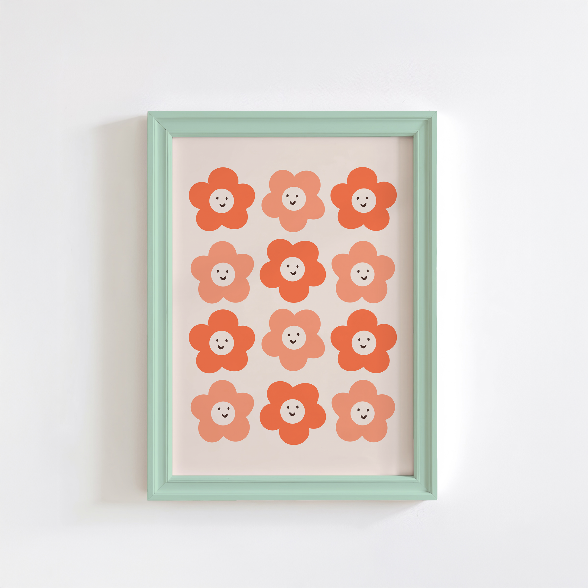 Brighten up your walls with this playful floral art print, featuring twelve smiling daisies illustrated in cheerful shades of tonal orange. Set against a soft cream background, this bold yet warm design brings a touch of retro-inspired charm and happy vibes to your space.