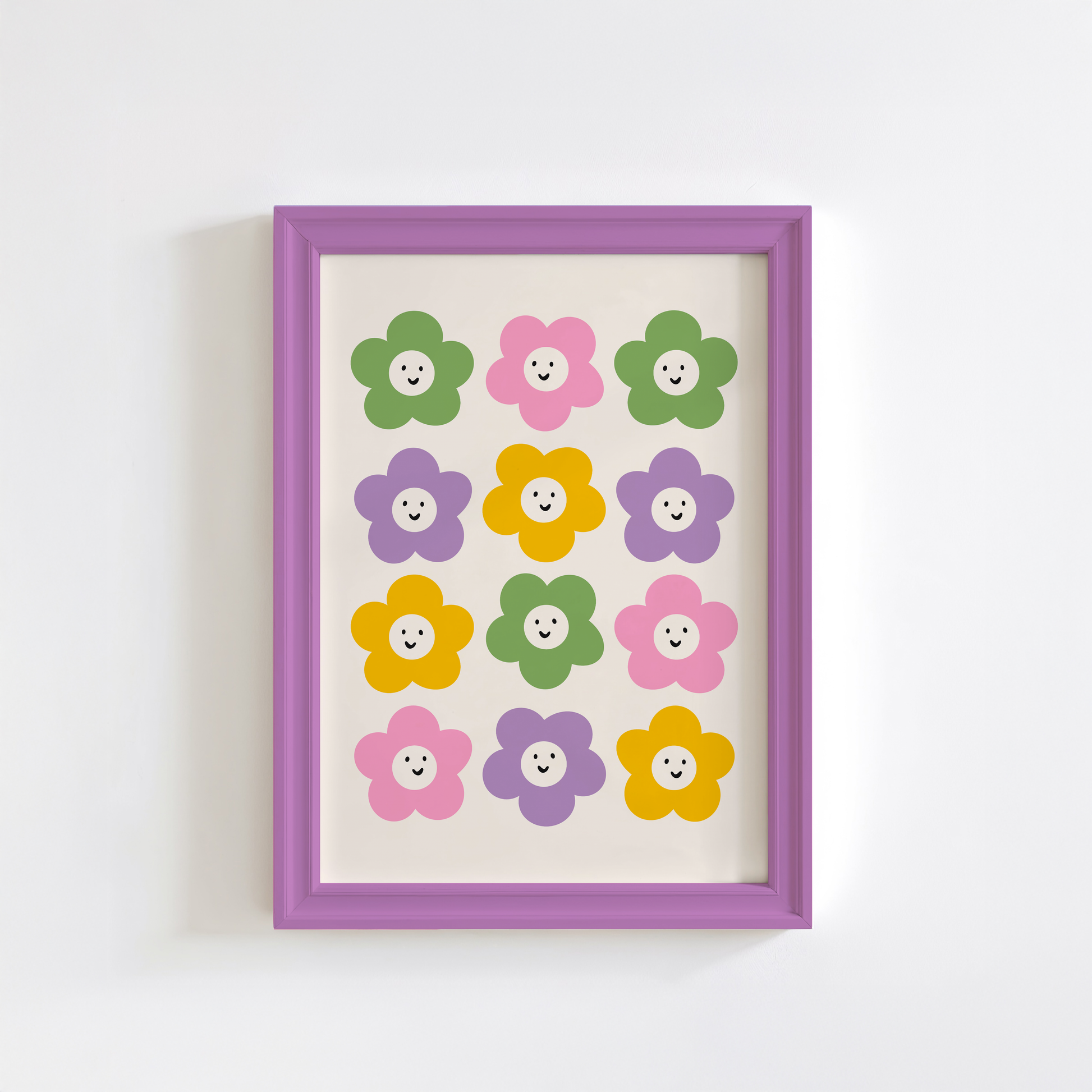 Bring some floral joy into your space with this vibrant daisy-themed print! Featuring 12 smiling daisies in a rainbow of happy colours, each flower beams with charm and positivity. Laid out in a neat 4x3 grid, the symmetrical pattern makes this a playful yet satisfying piece for any gallery wall, nursery, or cheerful corner of your home.
