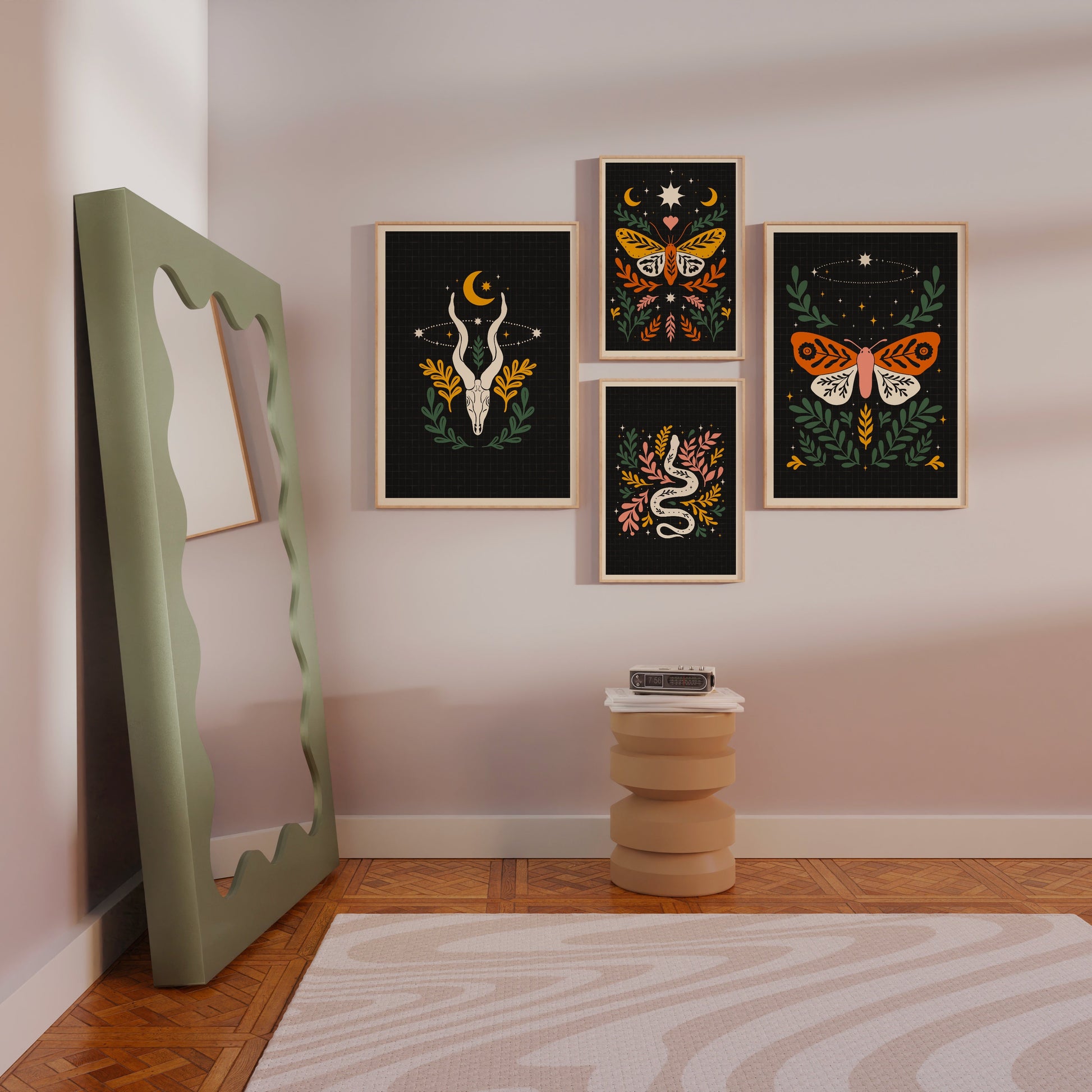 Be dark and mysterious with this limited edition print, featuring a snake illustration and a celestial pattern background. This dark and moody print is perfect for bedrooms and bathrooms.