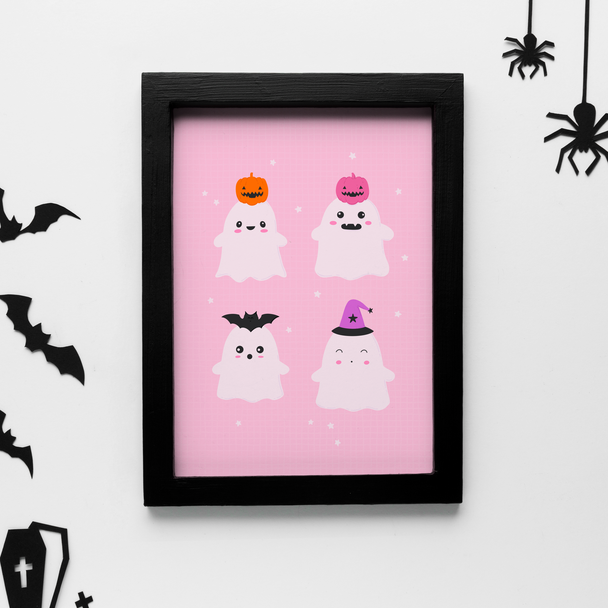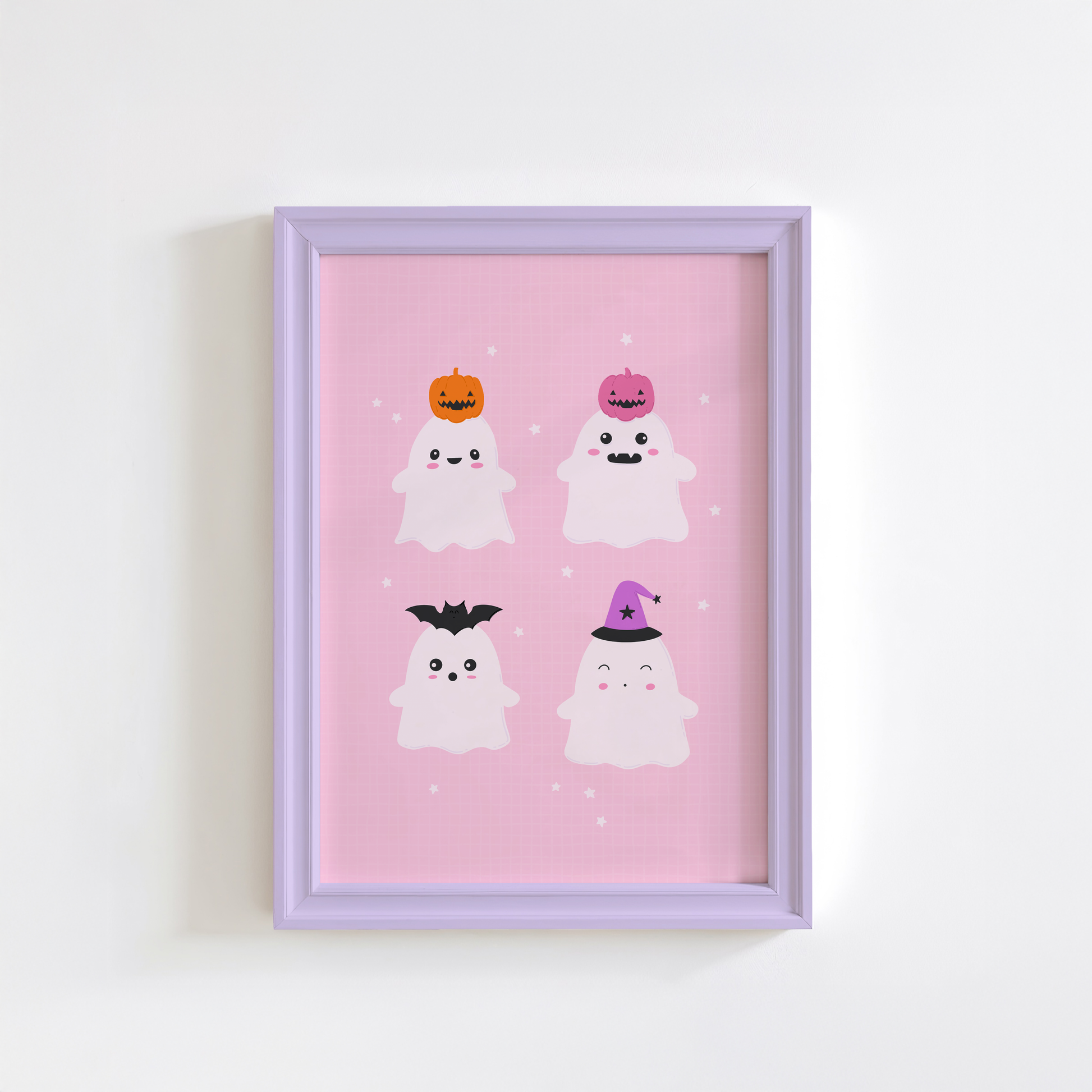 Bring some cheerful charm to your Halloween decor with this adorable pink art print featuring four friendly illustrated ghosts, each with their own little personality! From surprised to smiling, these sweet spectres are all dressed for the occasion in their quirky Halloween hats - witches, pumpkins and ... bat? With a soft pastel palette and playful illustration style, this is the perfect not-so-spooky print for lovers of cute Halloween aesthetics.