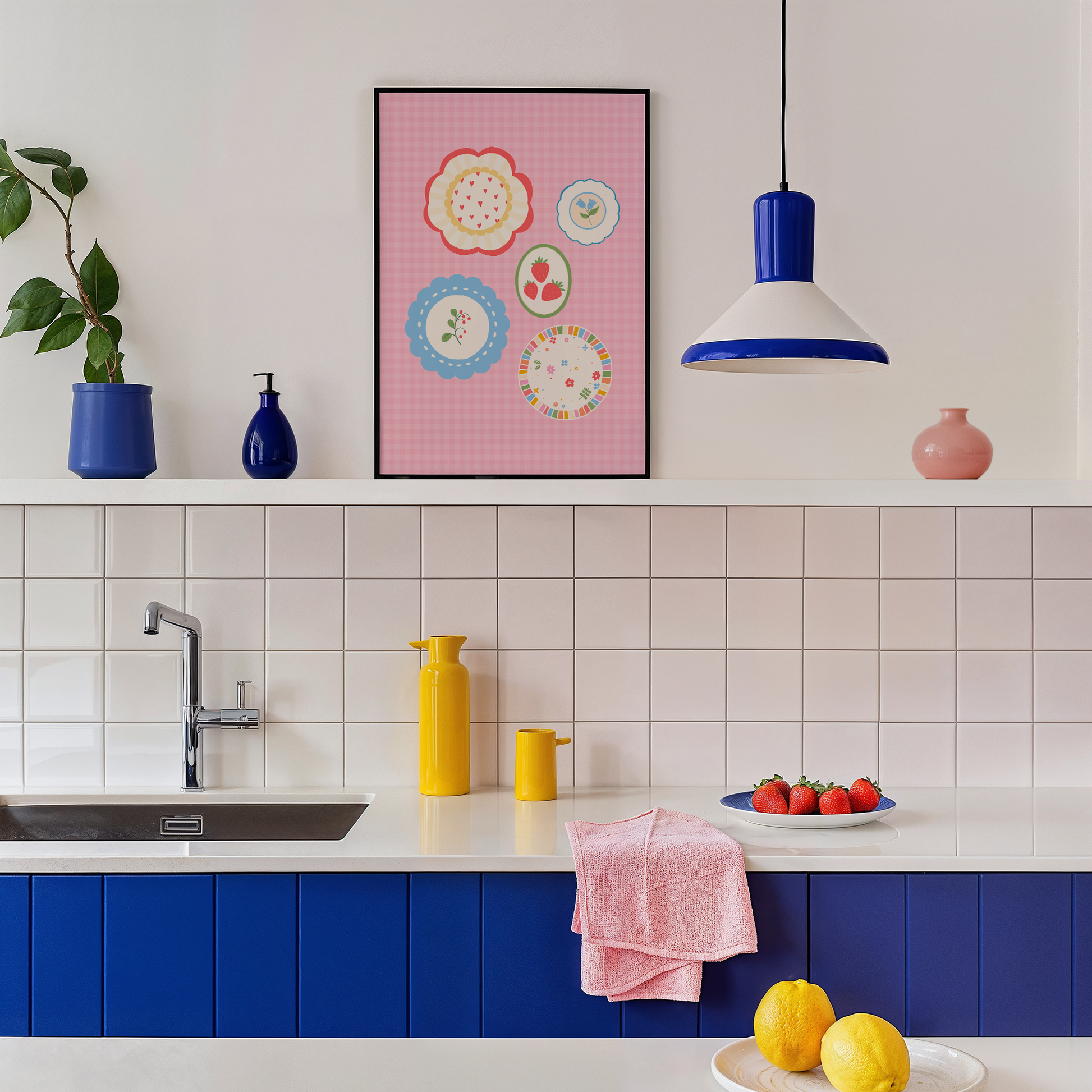 Bring a splash of charm and cottagecore flair to your space with this decorative plate wall art print. Featuring four beautifully illustrated plates set against a pink gingham background, this design nods to the growing trend of hanging decorative plates on the wall - without the need for hooks or ceramics! Each illustrated plate has its own unique pattern, creating a fun and whimsical display that’s perfect for kitchens, dining rooms, or gallery walls.