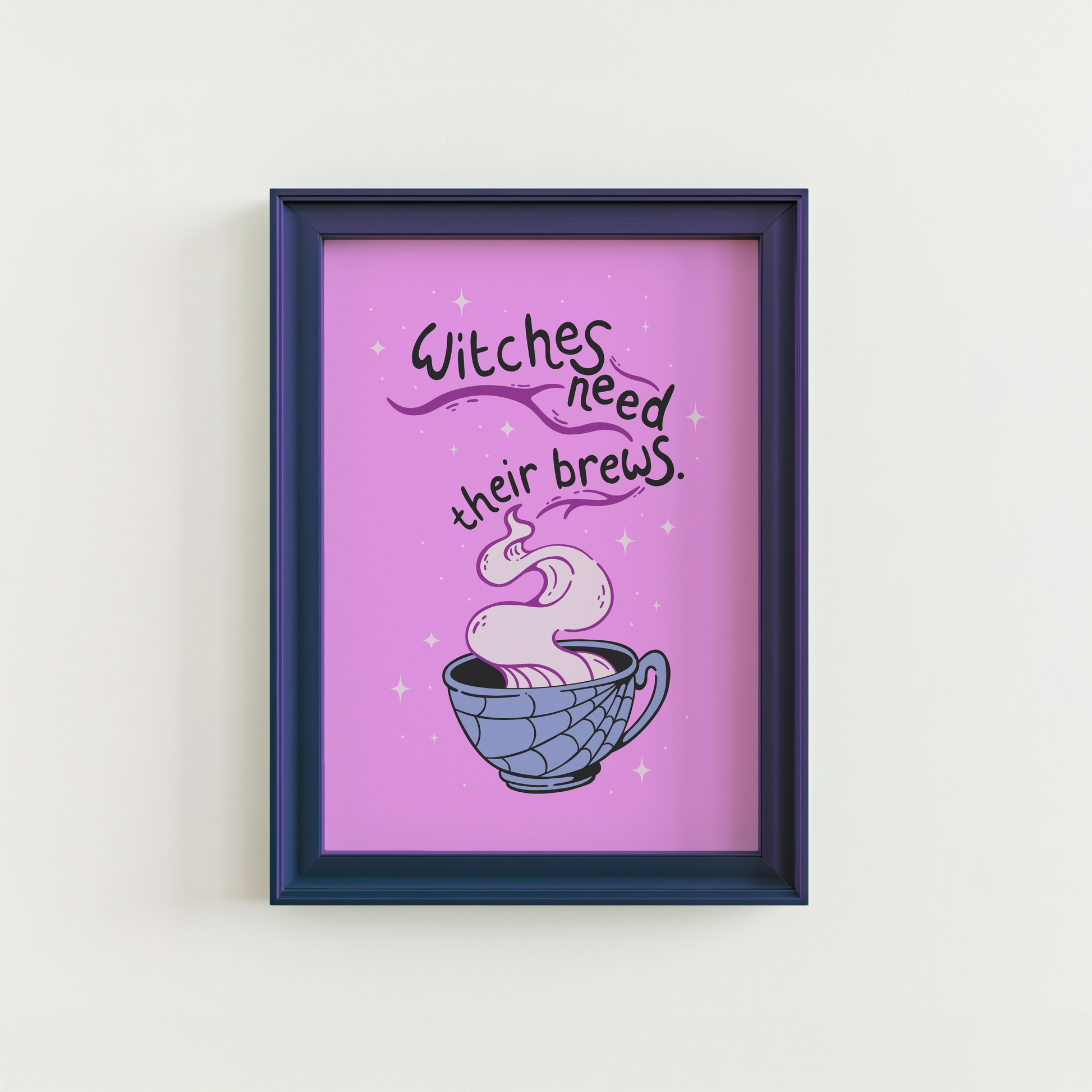 Stir up some spooky charm with this magical Halloween art print, perfect for witches (and coffee lovers!) everywhere. Set against a rich purple background, the design features a cosy illustrated mug with a spider web pattern and curling steam rising from the top. The swirling steam wraps around the hand-lettered phrase "Witches need their brews" - a fun nod to your daily dose of caffeine or potion of choice. It’s witchy, whimsical, and just the right amount of spooky-cute.